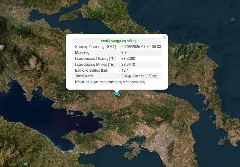 Σεισμός μεγέθους 3,7 Ρίχτερ σημειώθηκε το πρωί του Σαββάτου στη Θήβα.